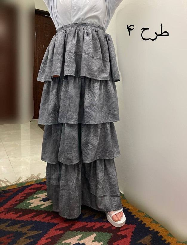 مشخصات طرح ۴: جنس: بوگاتی قد دامن ۱۰۱ دور کمر ۶۰ باکشسانی ۱۱۸ دور باسن ۱۱۲ دور پای دامن ۲۰۰
