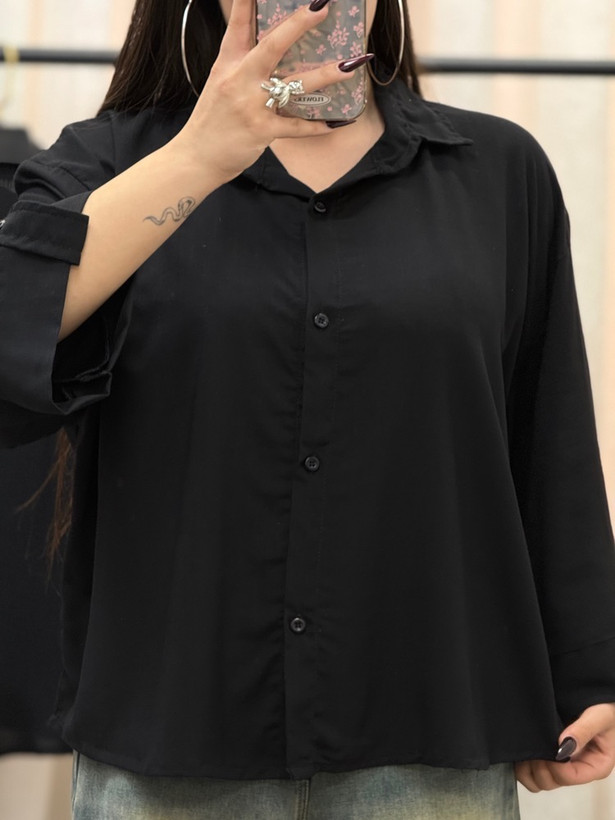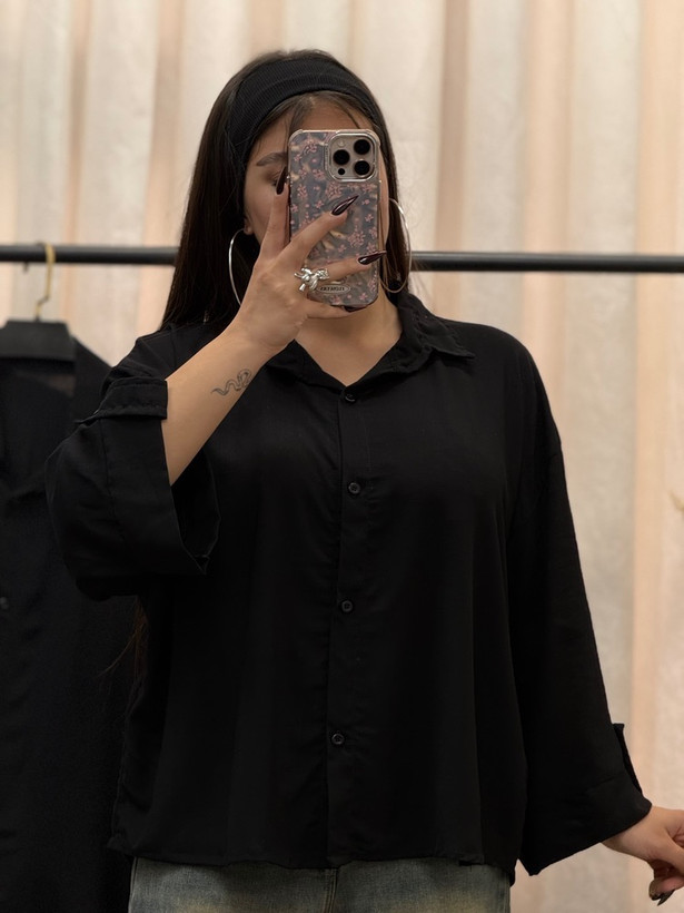 شومیز مشکی باکسی لینن گرم بالا که یه رنگ و مدل پرطرفداره که مورد علاقه دخترای تینیجری